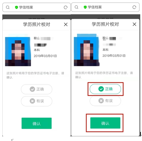 6、如無誤,請?jiān)趯W(xué)歷照片處點(diǎn)擊確認(rèn),然后告知自己的班主任,已完成圖像校對。如有誤,請第一時(shí)間聯(lián)系自己的班主任。